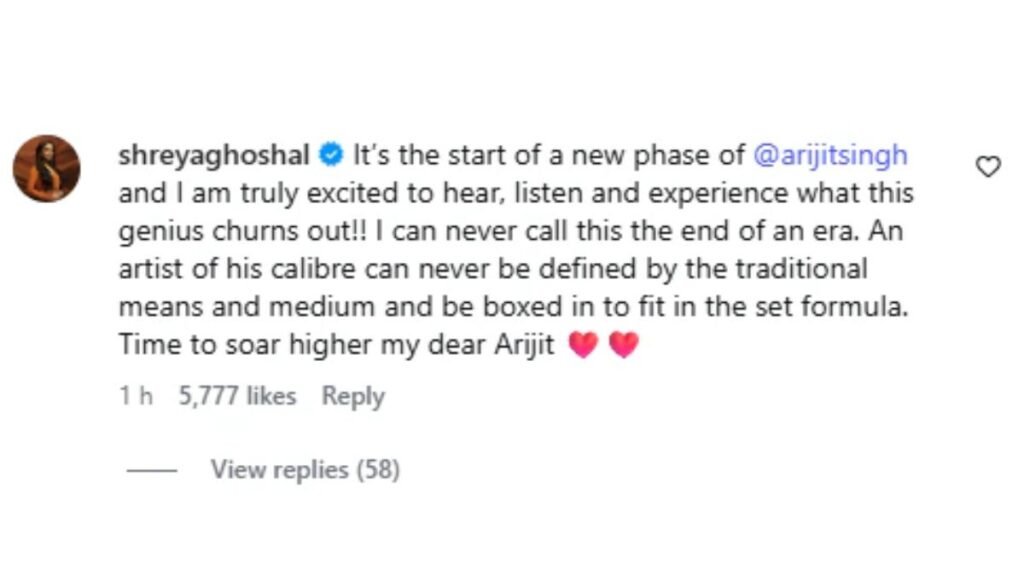 अरिजीत सिंह ने अपने आधिकारिक इंस्टाग्राम अकाउंट पर प्लेबैक सिंगिंग से संन्यास की जानकारी दी थी। इस पोस्ट पर कमेंट करते हुए श्रेया घोषाल ने लिखा कि यह अरिजीत के करियर का एक नया अध्याय है। उन्होंने कहा कि वह यह देखने और सुनने के लिए बेहद उत्साहित हैं कि यह जीनियस आगे क्या नया करेगा।